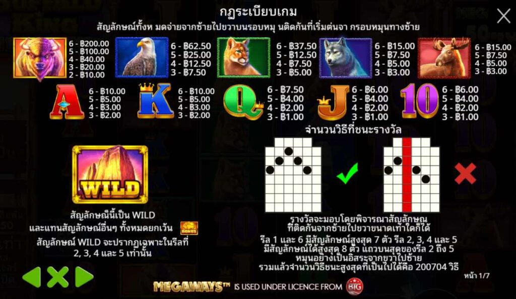 Buffalo King Megaways ใช้รูปแบบ 6 วงล้อ โดยจำนวนสัญลักษณ์ต่อรีลสุ่มตั้งแต่ 2-7 ตัวในทุกการหมุน ยิ่งมีจำนวนมาก ยิ่งเพิ่มโอกาสทำวิธีชนะสูงสุด โดยระบบสามารถสร้างเส้นทางชนะได้มากถึง 200,704 วิธี ในบางรอบ